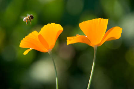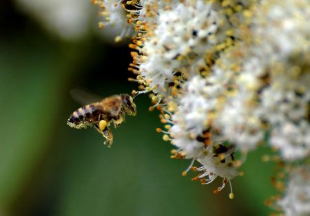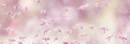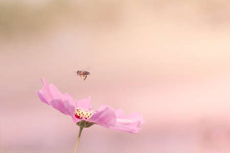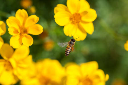 Bee in flight on a flower, honey bee. High resolution photo. Selective focus. Shallow depth of field.