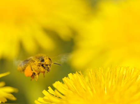 A bee collects pollen on a yellow dandelion. Pollination of a spring flower
