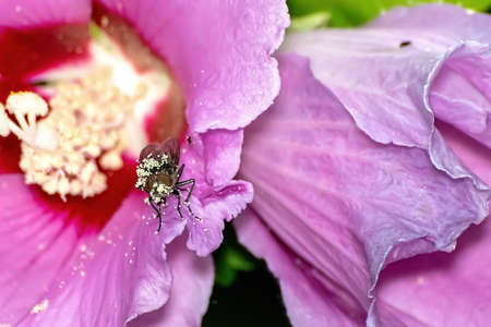 flower with dew dop and bee - beautiful macro photography with abstract bokeh background