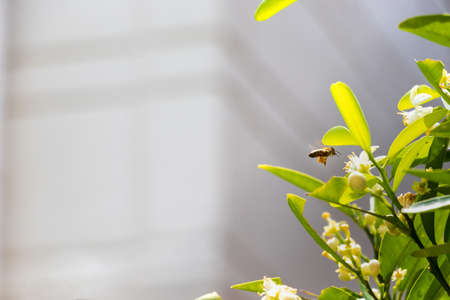 Close-up photo of a Honey Bee gathering nectar and spreading pollen on white flowers of white cherry tree. Important for environment ecology sustainability. Copy space