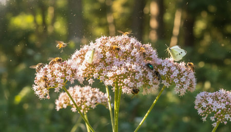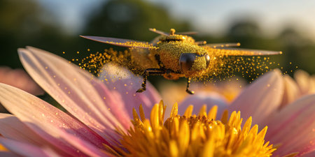 A bee flits among colorful petals, gathering golden pollen under a warm sun. The scene captures nature’s beauty and the important role bees play in the garden ecosystem.