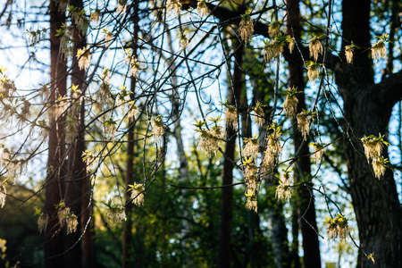 First, early spring, flowering, budding of trees, branches, leaves, background, free space, maple tree seeds Beautiful flowering awakening development sunny day