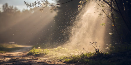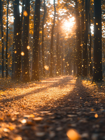 Golden dust motes dance in sunlit forest path, natures magic