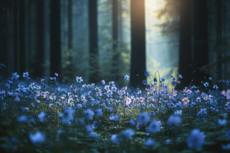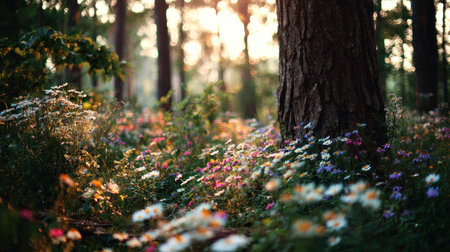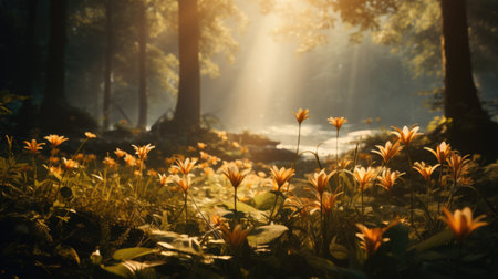 Spring flowers in the forest. Cinematic. AI generative.