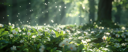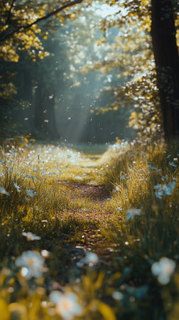 Sunlight streams through the leaves of tall trees, illuminating a vibrant green meadow filled with blooming flowers. A gentle breeze stirs delicate petals, creating a peaceful atmosphere.
