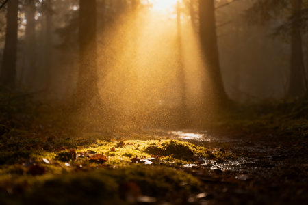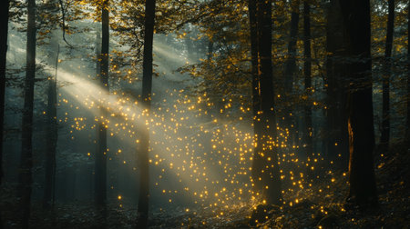 Explore a captivating forest scene filled with enchanting light particles and mist, creating a magical atmosphere that highlights the beauty of nature in autumn.