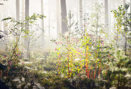 Foggy autumn forest with yellow flowers and sunbeams.