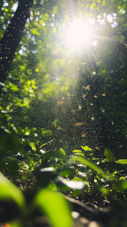 Sunlight through forest with flying insects, serene nature scene
