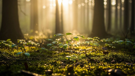 Serene showing sunbeams illuminating misty forest floor with emerging green sprouts and fallen leaves keywords:...