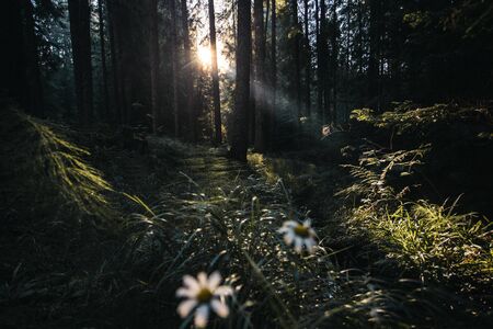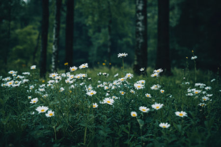 This image showcases a sunlit forest scene, featuring daisies in the foreground and a backdrop of trees. The composition utilizes natural lighting, creating a soft focus with warm tones. This visual could be used in various commercial applications, including editorial projects, to represent nature and tranquility.