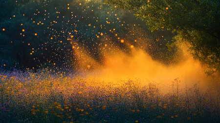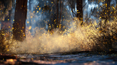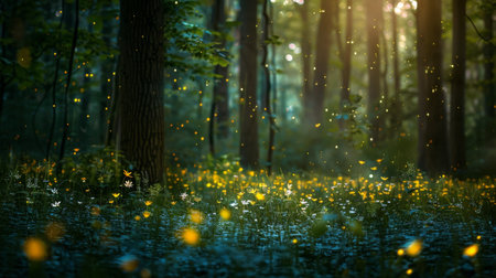 A mesmerizing scene of fireflies creating a natural light show in a forest as dusk settles in.