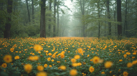 A stunning display of vibrant yellow flowers rising amidst a serene green forest, capturing the beauty of nature in full bloom. Perfect for nature enthusiasts.