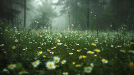 Wildflowers with bright yellow petals grow in a misty forest. The scene captures the enchanting atmosphere of dusk, with soft light glowing among the flowers and trees.