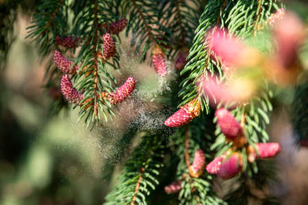 Pollen falling from conifer tree. Allergic season.