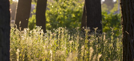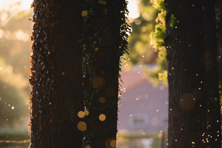 Tree trunks with blurred flies backlit by evening sunlight.