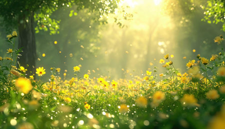 A vibrant meadow filled with yellow wildflowers, bathed in warm sunlight, showing the beauty of nature.