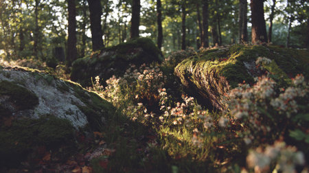 A serene forest scene showcasing moss-covered rocks surrounded by delicate wildflowers, illuminated by soft sunlight, evoking a sense of peace and natural beauty.