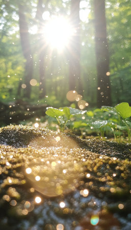 Glorious sunlight filters through leaves, creating a magical scene with sparkling droplets of dew. A serene moment celebrating nature's beauty.