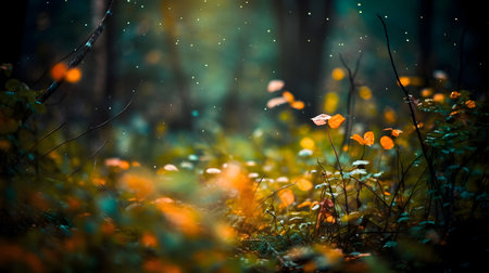 Autumn forest with bokeh lights and falling leaves. Nature background