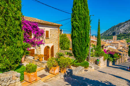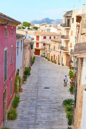View At carrer del Calvari With Typical Old Houses And City Center Pollença, old village on the island Palma Mallorca, Spain
