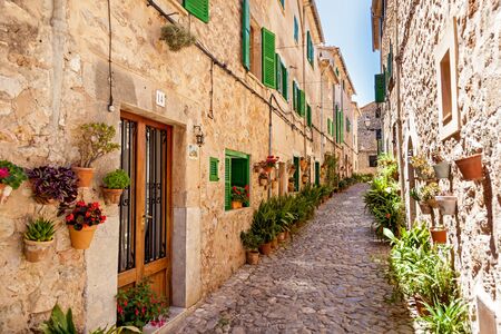 Beautiful street in Valldemossa, famous old mediterranean village of Majorca Spain