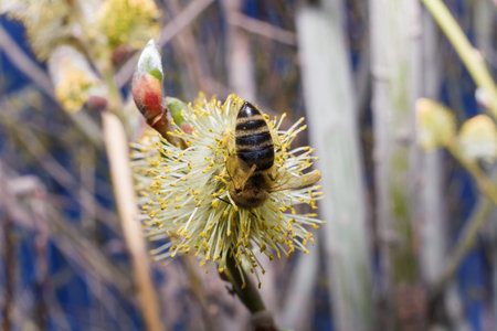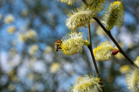 The bee collects pollen on the flowering tree. Bee on catkins. Yellow pollen on twigs and on bee.(Multiple Values)