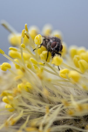 A black fly on the pistils of a willow flower.