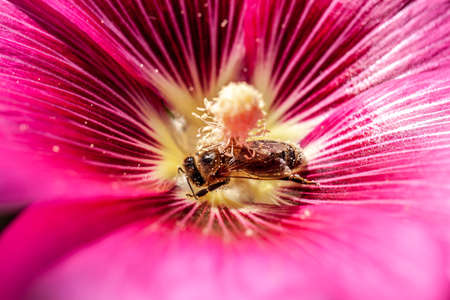 Honey bee covered with yellow pollen drink nectar, pollinating flower. Inspirational natural floral spring or summer blooming garden background. Life of insects, Extreme macro close up selective focus