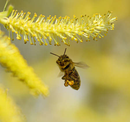 A bee in flight on a yellow willow flower. Close-up.