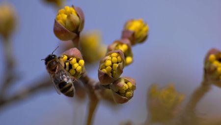 Soft focused macro shot of a bee gathering pollen from flowers bud on tree branch. Blurry blue background. Spring concept.