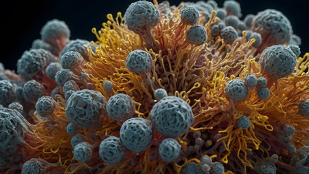 Discover the intricate details of cellular structures under a microscope, showcasing yellow granules within organic filaments. Perfect for scientific exploration.