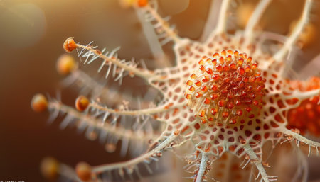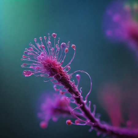 a close-up portrait photograph showcasing the intricate details of unknown staphylococcus aureus biological virus alien flowers. the image captures the brittle yet beautiful and elegant nature of these flowers, with rich and vivid contrast. shot on a 100mm lens at f/2.0, the photo exhibits a crisp and realistic quality, enhanced by the depth of field and natural lighting. this impressive 8k uhd image is a