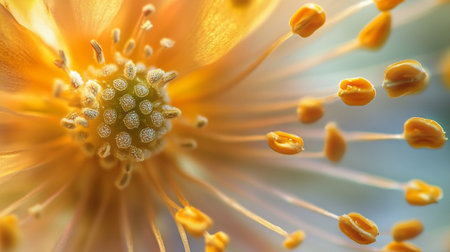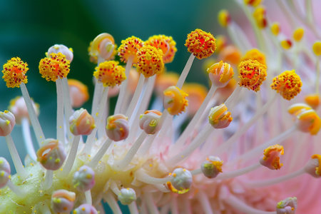 extreme close-up of colorful pollen grains on petal, created with generative ai