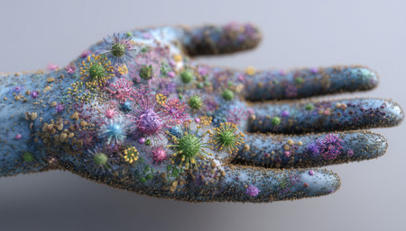 A creatively styled hand displays a vivid array of tiny fungi and molds, highlighting microbial diversity with a neutral gray backdrop.
