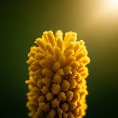 Microscopic pollen grains with spikes and golden dust .Generative AI