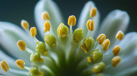 Delicate yellow stamen showcase vibrant pollen grains, inviting pollinators to explore the intricate beauty of nature\'s design.