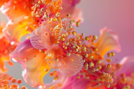 Close up view of pollen grains resting on the delicate stamen of a flower highlighting vivid colors and fine details. The intricacies of nature are beautifully showcased in this macro shot.