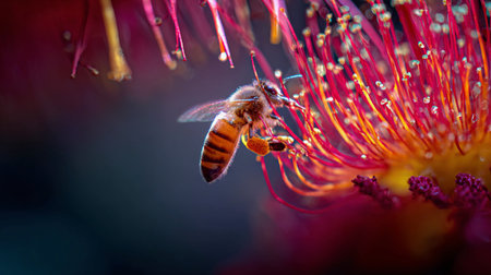Close-up view of a honey bee gathering pollen from a colorful flower in a vivid natural environment.