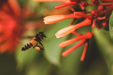 Honey bee getting nectar from the Jamaican cherry flower also known as Strawberry tree flower and pollinate the flower. Used selective focus.
