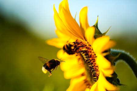 nature seasonal background the bee feeds on a sunflower