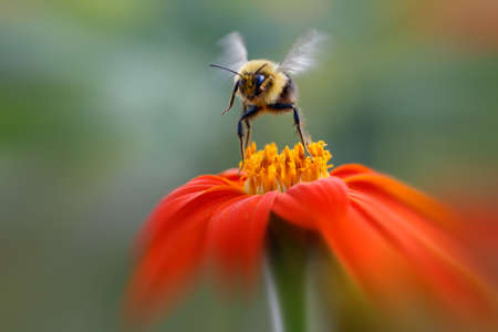 A bumblebee with black and yellow stripes, sitting on an orange flower. The background is blurred to focus attention on the bee. --v 6.1 Job ID: ff00e2ec-39f2-422a-acdc-37ab9e73cc0c