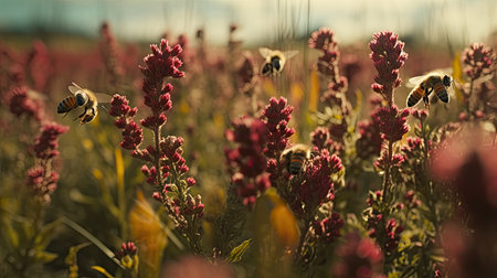 A captivating scene showcasing busy bees pollinating colorful wildflowers, bathed in golden sunlight, revealing the beauty of nature