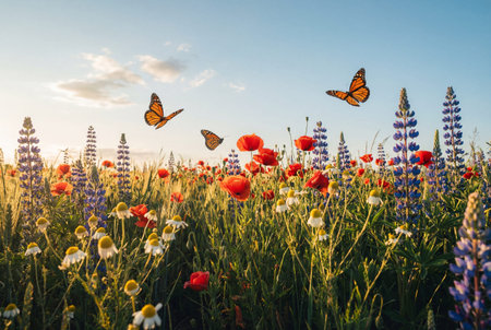 A vibrant green field blooms with red poppies blue lupines and white daisies while orange monarch butterflies fly above under a warm sunny sky during a bright golden sunset