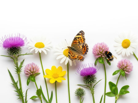 A collection of colorful wildflowers, including daisies and clovers, with a butterfly and a bee resting on them.