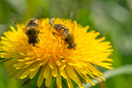 daylight. bee closeup on dandelion. have toning. shallow depth of cut.