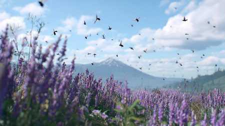 Low-angle view captures an expansive field dominated by tall stalks of purple blossoms in full bloom, suggesting lavender or a similar flowering plant. Above the flowers, many small, dark birds are scattered across the bright blue sky dotted with white, puffy clouds, with a large, snow-capped or pale mountain visible in the soft-focus background.