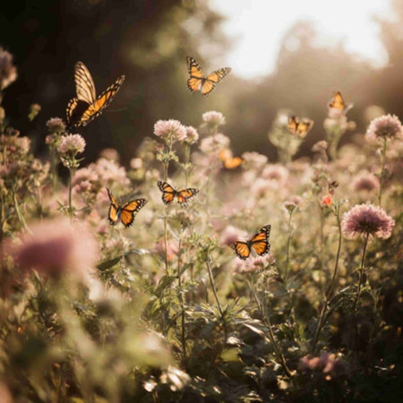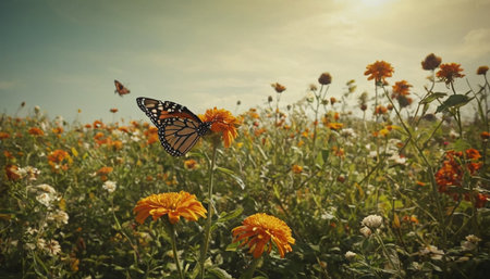 This stunning nature scene captures butterflies gracefully navigating a colorful field. The wildflowers, with their range of hues, provide a vibrant backdrop for the delicate butterflies.