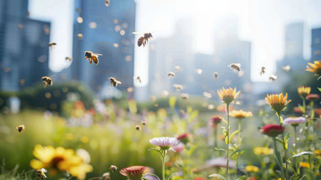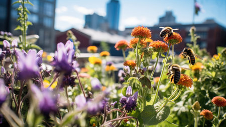 Urban beekeeping initiative with rooftop hives pollinate city gardens, supporting local biodiversity