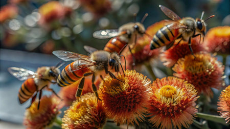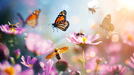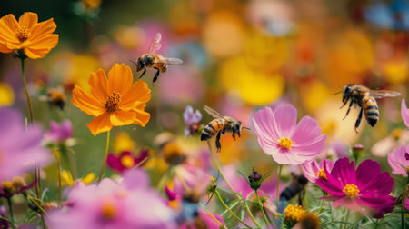 A stunning scene features buzzing bees collecting nectar from vibrant flowers under bright sunlight, showcasing the beauty and importance of pollination in nature.