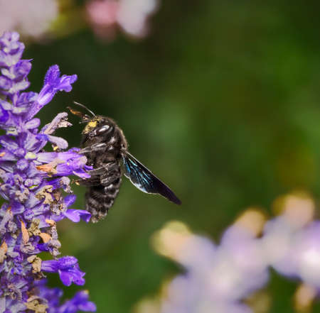 Macro of a violet carpenter bee (xylocopa violacea) collecting nectar on a sage flower